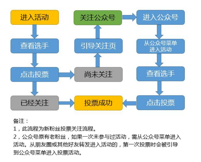 此流程主要针对新粉丝投票关注流程展示,这个是大部分活动的主要目的,通过活动吸引大量新粉丝关注公众号。所以流程中主要为新粉丝未关注公众号的流程。